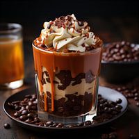 Het beeld toont een verleidelijk glas met romige chocolade frappe, bekroond met weelderige slagroom, omringd geurige koffiebonen. De contrasterende texturen en aroma's creëren een visueel feest.
