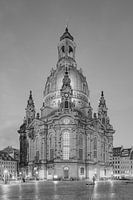 Uitzicht vanaf de Neumarkt naar de verlichte Frauenkirche in Dresden in de avond. Een eenzame muzikant staat op het marktplein, speelt liedjes op zijn gitaar en hoopt op publiek.
