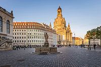 De na verwoesting opnieuw opgebouwde Frauenkirche licht op in de ondergaande zon (Saksen, Duitsland).