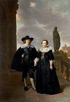 Frederick van Velthuysen en zijn vrouw Josina, Thomas de Keyser In de jaren 1630 was Thomas de Keyser de meest modieuze portretschilder in Amsterdam. Zijn werk was zeer populair bij de midden- en hogere klasse van de stad. De Keysers schilderijen worden gekenmerkt door een zeer gedetailleerde, realistische stijl en door figuren in tamelijk formele poses. Deze manier van schilderen was in het begin van de zeventiende eeuw in Nederland in zwang en de Keyser had als een van de belangrijkste exponenten van deze stijl een sterke invloed op andere kunstenaars, waaronder de jonge Rembrandt. Dit schilderij toont de Keyser op zijn briljantst, vooral in zijn meesterlijke behandeling van verschillende stoffen en texturen. De geportretteerden zijn Frederick en Josina van Velthuysen, en het paneel is een soort 'huwelijksportret', een genre dat kennelijk zijn oorsprong vindt in de Nederlandse schilderkunst. In de meeste gevallen waren huwelijksportretten uitingen van de vermeende sociale en economische status van de geportretteerden. De kleding was van primair belang, en hier duidt de kwaliteit van de kleding op rijkdom en een hoge sociale status. In overeenstemming met de Nederlandse protestantse tradities zijn de kostuums, hoewel rijk, niet opzichtig. Als zoon van een burgemeester van Utrecht behoorde Frederik van Velthuysen tot de elite van de stad. Het paar is afgebeeld op het terras van een classicistisch gebouw, tegen de achtergrond van een Italiaanse stad en landschap.