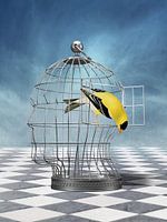 Surrealistisch, modern werk. Vogelkooi in de vorm van een hoofd en een prachtige gele vogel die onwennig zijn vrijheid pakt.