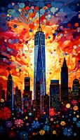 Dit levendige acrylverf schilderij toont de indrukwekkende One World Trade Center in Manhattan, New York die ook wel bekend staat als Freedom Tower in een unieke geometrische abstractie. De afbeelding is speels maar verfijnd, met een gouden middaglicht dat de toren verlicht tegen een achtergrond van gedurfde en pastelkleuren. De zachte omgevingsverlichting en het gelaagde penseelwerk creëren een diepte en textuur