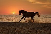 Arabisch paard op het strand tijdens zonsondergang. Vol in galop door de branding