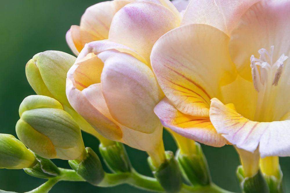 Close up, macro foto van een freesia bloem. Een bloem is helemaal open, twee knoppen gaan open en de overige knoppen zijn nog dicht. De bloem is wit geel rose.