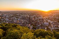 Uitzicht vanaf Schlossberg over Freiburg im Breisgau met de dom bij zonsondergang.