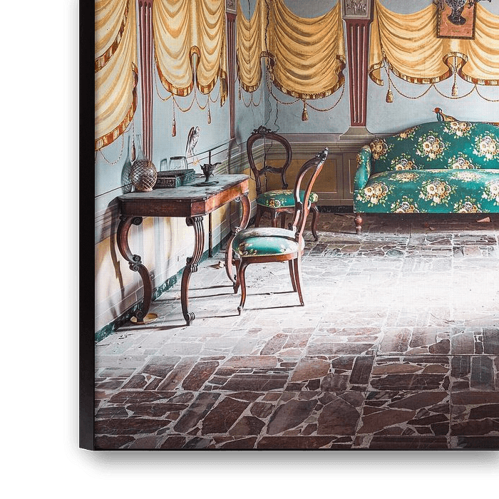 Ik fotografeerde deze kamer op de eerste verdieping in een verlaten Italiaanse villa. De hele kamer is bedekt met deze prachtige schildering die nog grotendeels intact is. De kamer is ogenschijnlijk nog niet aangeraakt door vandalen, terwijl de rest van de villa een complete puinhoop is. Het is al een tijdje verlaten en er zijn geen plannen om het pand te verkopen of te renoveren.