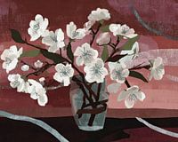 Fresh Blooms for Modern Homes - Dit bloemen schilderij toont een prachtige vaas met witte bloesems, die frisheid en levendigheid uitstraalt op een warme, roestbruine achtergrond.