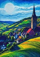 Dit prachtige beeld toont het pittoreske stadje Freudenberg, Duitsland, met zijn charmante vakwerkhuizen genesteld tussen glooiende groene heuvels. Een hoge kerktoren is prominent aanwezig en draagt bij aan het traditionele karakter van het stadje. Het landschap baadt in levendige tinten groen, geel en blauw en creëert een dromerig, schilderachtig effect. Het tafereel geeft prachtig de essentie weer van de landelijke charme van Freudenberg, waarbij geschiedenis en natuur op een fascinerende manier samenkomen.