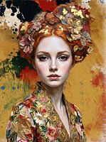 Een betoverend portret toont een jonge vrouw met vurige rode haren, afgebeeld in een rijk versierde, vintage bloemen kimono. Haar haar is opgestoken en versierd met een krans van gedetailleerde, goudkleurige en pastelkleurige…