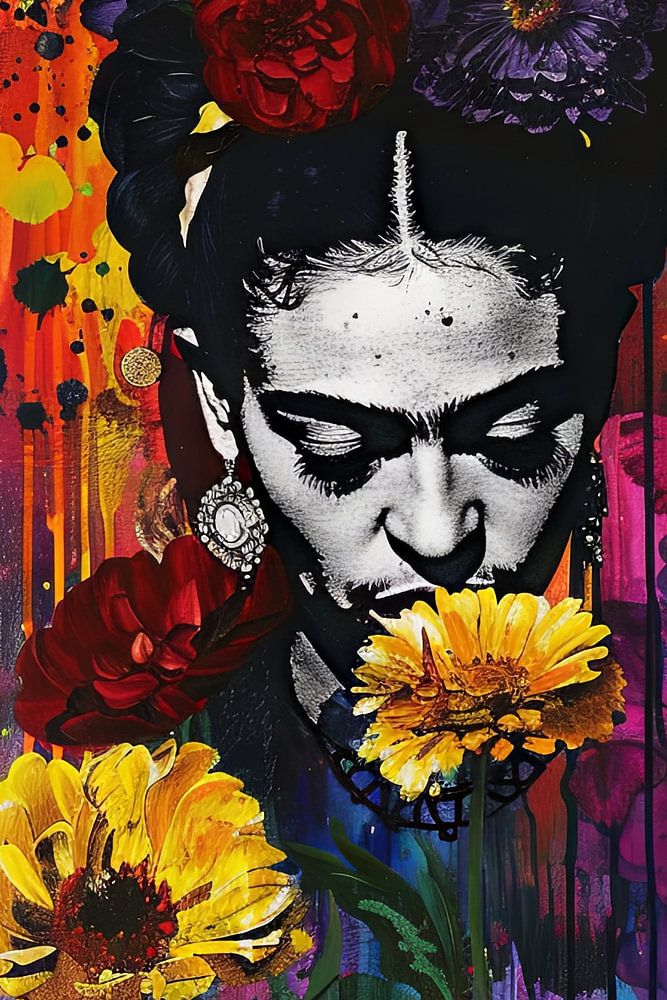 Dit krachtige portret van Frida, gehuld in een explosie van bloemen en kleur, is een fascinerende weergave van haar complexe emotionaliteit. De dynamische kleurverlopen en dikke textuur van de kleuren creëren een abstracte schoonheid die zowel mysterie als fascinatie oproept. Een blikvanger voor elke collectie, die kijkers uitnodigt tot een dialoog over de diepte van menselijke emotie en de pure vitaliteit van de natuur.
