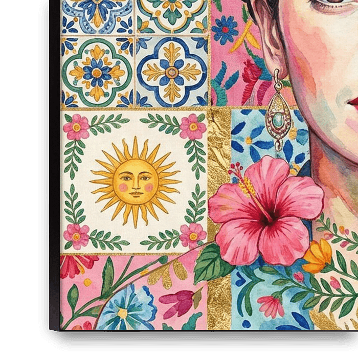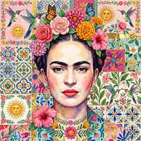 Het kleurrijke portret van de Mexicaanse Frida, bekend om haar kenmerkende monobrauw en expressieve blik, omringd door symbolische elementen.