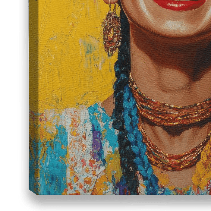 Koop dit schilderij Frida: Een dans van kleuren die de ziel bevrijdt van Niklas Maximilian als reproductie geprint op canvas, aluminium dibond, (ingelijste) fotoprint, behang en ArtFrame. Voor jou op maat geprint in Fine-Art kwaliteit.