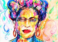 Een kleurrijk portret van Frida geteked met viltstiften en een beetje water waardoor het net een aquarel wordt. Frida was en is een bekende Mexicaanse schilderes, vooral bekend om de kleuren die zij gebruikte . Zij had altijd bloemen in haar haar . Haar Bohemien kleding wordt nog steeds gekopieerd. Het is zwierig met kant en stroken en lange rokken. Zij was een feministe stond op de bres voor de vrouwen.