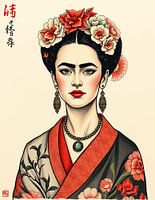 Frida's portret in Japanse schilderkunst legt haar essentie vast door middel van delicaat penseelwerk en levendige kleuren. Het werk is beïnvloed door traditionele ukiyo-e technieken en combineert bloemmotieven en subtiele landschapselementen, die haar diepe verbondenheid met de natuur en identiteit symboliseren en tegelijkertijd haar veerkracht en passie uitdrukken.