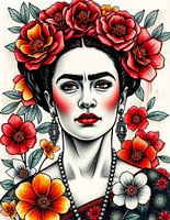 Frida's portret in Japanse schilderkunst legt haar essentie vast door middel van delicaat penseelwerk en levendige kleuren. Het werk is beïnvloed door traditionele ukiyo-e technieken en combineert bloemmotieven en subtiele landschapselementen, die haar diepe verbondenheid met de natuur en identiteit symboliseren en tegelijkertijd haar veerkracht en passie uitdrukken.