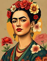 Frida's portret in Japanse schilderkunst legt haar essentie vast door middel van delicaat penseelwerk en levendige kleuren. Het werk is beïnvloed door traditionele ukiyo-e technieken en combineert bloemmotieven en subtiele landschapselementen, die haar diepe verbondenheid met de natuur en identiteit symboliseren en tegelijkertijd haar veerkracht en passie uitdrukken.