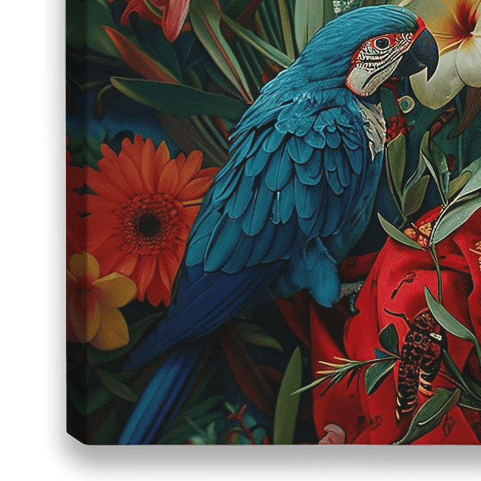 Een levendig en dynamisch olieverfschilderij toont Frida omringd door exotische vogels, bloeiende bloemen en een weelderig landschap. Het kleurenpalet moet gevarieerd zijn, met levendig blauw, rood, groen en geel om de schoonheid in de onmiskenbare stijl van Frida vast te leggen.