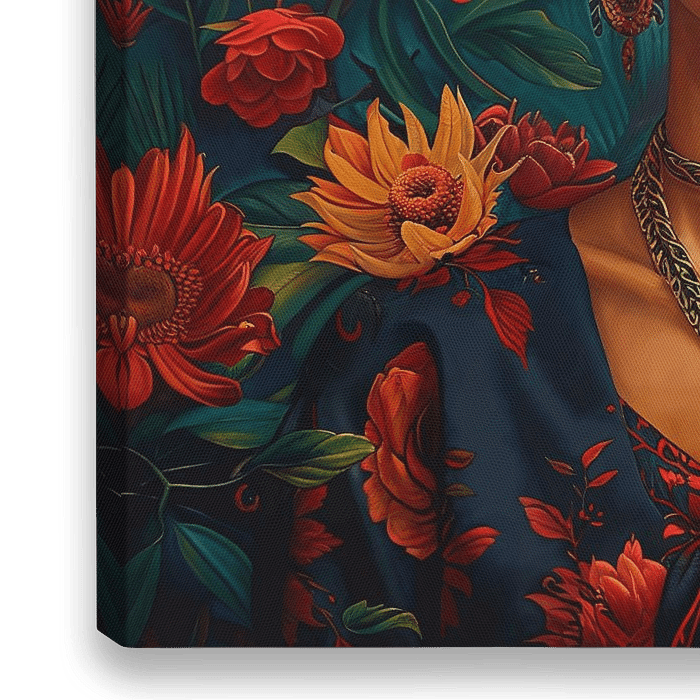 Een levendig en dynamisch olieverfschilderij toont Frida omringd door exotische vogels, bloeiende bloemen en een weelderig landschap. Het kleurenpalet moet rijk zijn, met levendig blauw, rood, groen en geel om de schoonheid in de onmiskenbare stijl van Frida vast te leggen.