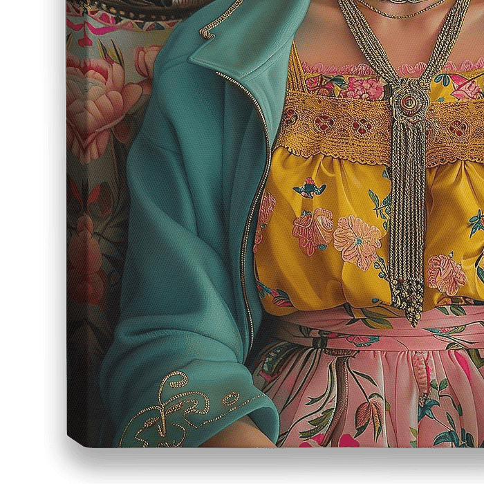 Frida portret, zittend op haar bank in de stijl van turquoise en roze bloemmotieven, draagt een open jasje over een gele jurk, medium shot, portret over het hele lichaam in olieverfschilderij, gekleurd, gedetailleerd gezicht en ogen, gedetailleerde achtergrond, zacht licht, zachte schaduwen.