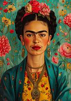 Frida portret met een kleurrijke bloemenachtergrond. Ze draagt een turquoise blauw jasje en een gele jurk met een gouden ketting en oorbellen. Haar gezicht is prachtig met grote ogen en pruilippen.