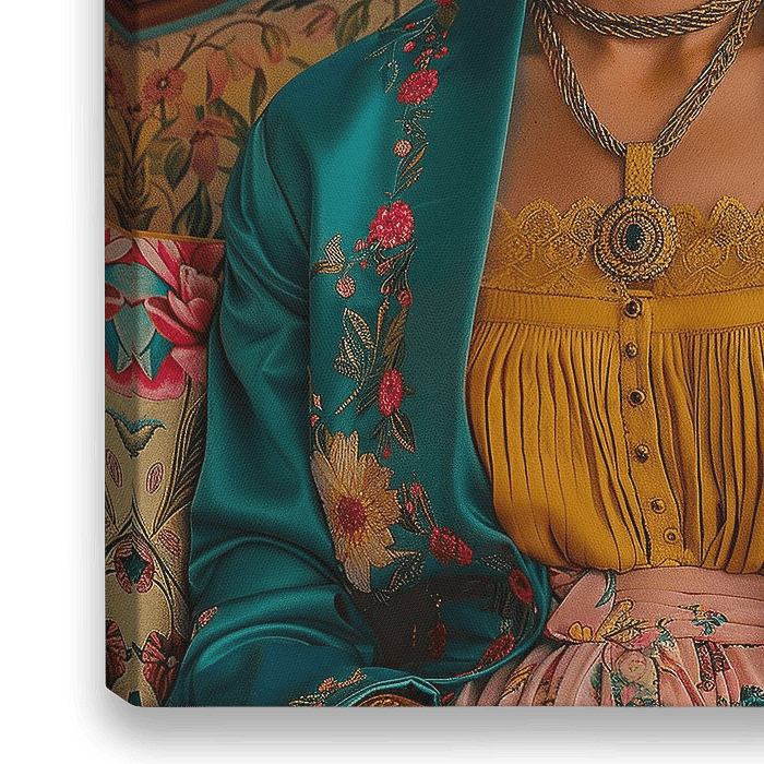 Frida zit op een bank in haar kamer op een portretfoto. Achter haar is een kleurrijke bloemenachtergrond te zien. Ze draagt een turkooisblauw jasje met een gele jurk eronder en gouden sieraden om haar nek. Haar haar is gevlochten en ze draagt roze bloemen op haar hoofd. De kleuren zijn levendig met zachte belichting en veel detail in…