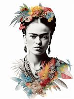Deze boeiende zwart-wit afbeelding van Frida belichaamt haar iconische persoonlijkheid, terwijl kleuraccenten haar unieke flair benadrukken. De monochrome tinten leggen de nadruk op haar kenmerkende wenkbrauwen en de intensiteit van haar blik.