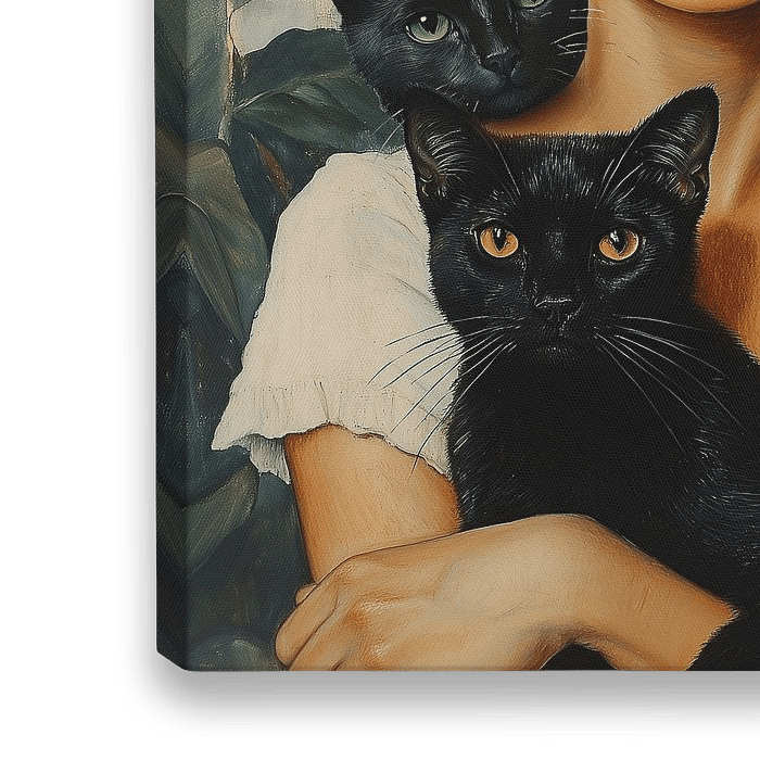 "Dit portret vangt de iconische kunstenares Frida in al haar essentie, omringd door zwarte katten die mysterie en kracht oproepen. De katten, symbolen van onafhankelijkheid en raadselachtigheid, vullen haar sterke en unieke aanwezigheid aan, terwijl de weelderige groene achtergrond het contrast tussen het huiselijke en het wilde…