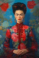 De prachtige kledingdetails op het schilderij benadrukken de unieke stijl van Kahlo en haar chinapunk-invloeden, waardoor het werk een opvallende artistieke uitstraling krijgt. Dit studioportret is een eerbetoon aan haar aanwezigheid in de kunstwereld.