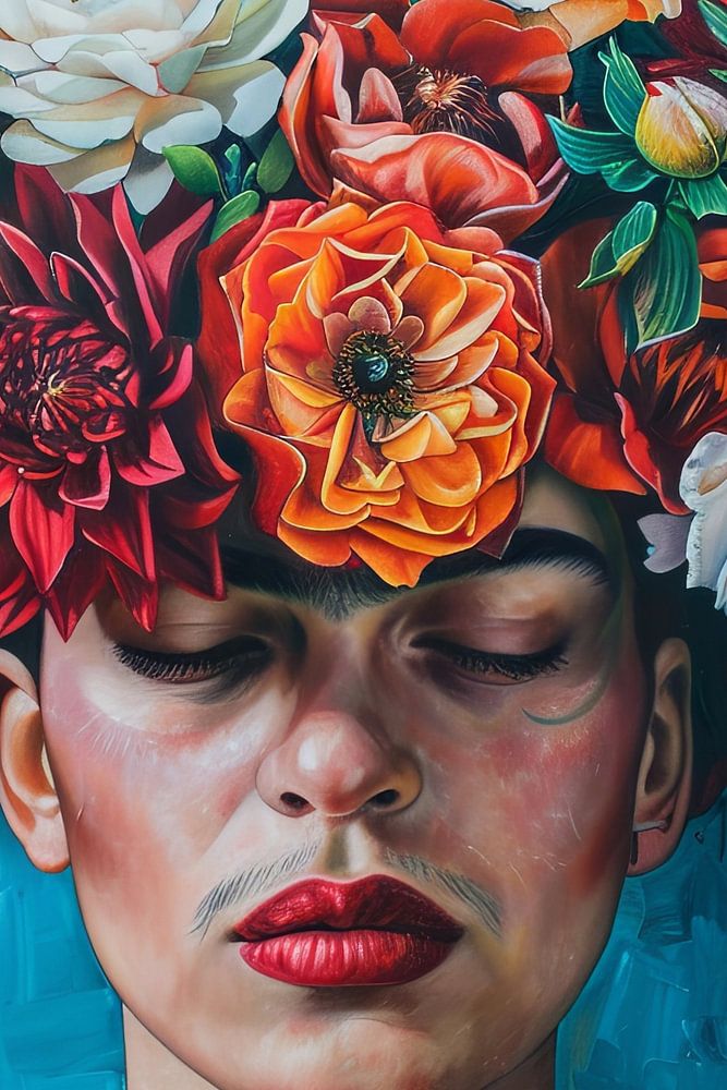 Deze kunstzinnige afbeelding van Frida's gezicht omringd door bloemen verweeft de essentie van bloemenpracht met menselijke gratie. Levendige kleuren en zorgvuldig uitgewerkte details vieren zowel de schoonheid van de natuur als de menselijke geest. Elke bloesem is met oog voor detail geschilderd en trekt de kijker mee in een wereld van kleur en leven. Het werk is een eerbetoon aan de kracht van de natuur en haar rol in onze culturele identiteit, een waar pronkstuk voor elke collectie. Het is perfect voor een moderne woonomgeving of als blikvanger in een galerie die hedendaagse invloeden combineert met traditionele schoonheid.