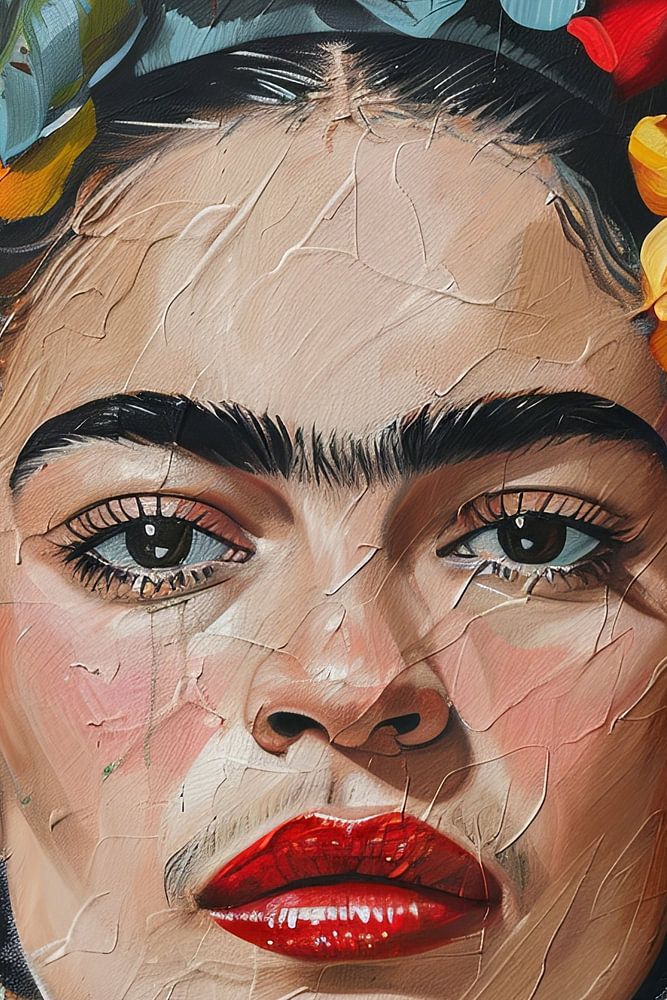 In dit kunstwerk dat de unieke esthetiek van Frida weergeeft, staat de kunstenares zelf centraal, omringd door een weelderige bloemenpracht. Kahlo's gezichtsuitdrukking straalt een mengeling van kracht en tederheid uit, terwijl de bloemen om haar heen een verscheidenheid aan emoties en betekenissen vertegenwoordigen. De bloemen, die variëren van felle kleuren tot zachte pasteltinten, voegen een diepe sensualiteit en vitaliteit toe die kenmerkend is voor de werken van Kahlo. Elke bloem lijkt zijn eigen verhaal te vertellen en hun opstelling rond Kahlo creëert een harmonieus evenwicht tussen de levende natuur en de sterke persoonlijkheid van de kunstenares. Deze compositie brengt niet alleen de schoonheid van de natuur over, maar ook de innerlijke wereld en rijke emotionele rijkdom van Frida zelf, gevangen in een tijdloos kunstwerk dat de kijker in vervoering brengt.