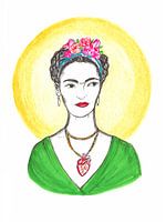Deze Mexicaanse kunstenares, Frida, draagt een anatomisch hart en een traditioneel hoofdtooi. Ze is omgeven door een halo, omdat ze velen geraakt heeft met haar passie.