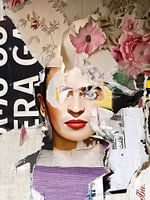 Een portret van Frida opgebouwd uit verschillende lagen behang en gescheurde posers.