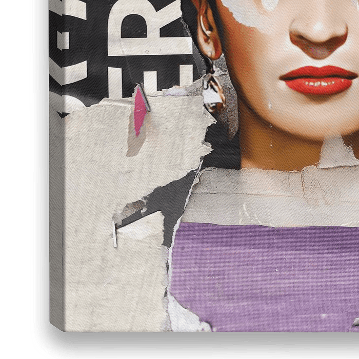 Een portret van Frida opgebouwd uit verschillende lagen behang en gescheurde posers.