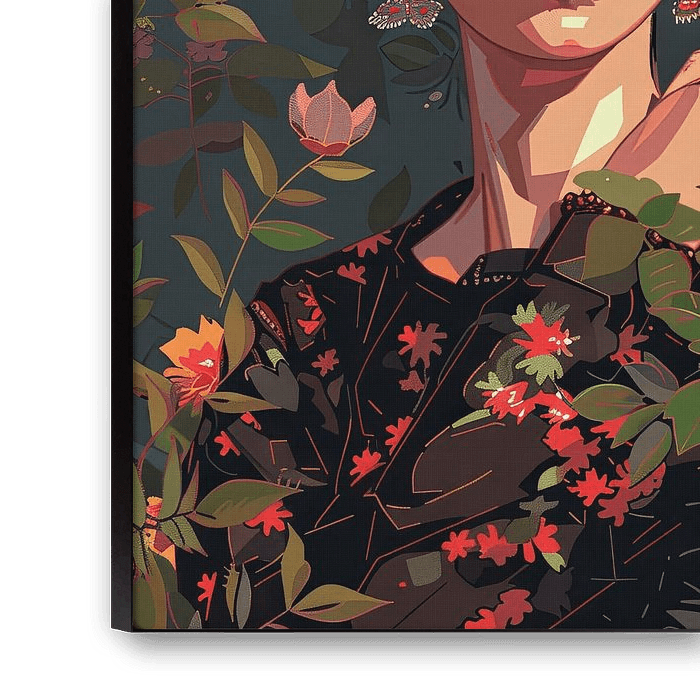 Dit portret vereeuwigt Frida's levensbevestigende energie door middel van een explosie van levendige bloemen die schitteren tegen een stralend gele achtergrond. De intensiteit van haar blik en de rijke kleurschakeringen van de bloemen creëren een kunstwerk dat zowel krachtig als delicaat is. Het is een ode aan Frida's kenmerkende stijl en haar verbondenheid met de natuurlijke wereld, perfect voor verzamelaars met een passie voor iconische persoonlijkheden en bloeiende schoonheid. Dit schilderij is een symbool van zelfexpressie en zou elke galerie of creatieve inrichting verfraaien.