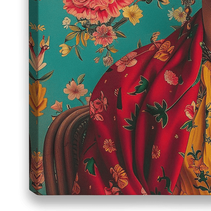 Een levendig portret van Frida, getooid met haar iconische rode en gele bloemenkleding tegen een achtergrond van turquoise bloemen, die een aura van zelfvertrouwen in "Frida's lengte" vastlegt en doet denken aan de stijl van Dali's surrealisme. De achtergrond is gevuld met heldere kleuren en ingewikkelde patronen en creëert…