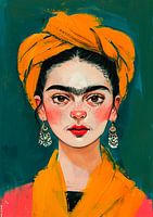 Portret van Frida in cartoonstijl, oranje tulband met gele accenten, kleurrijke oorbellen, eenvoudige achtergrond, penseelstreken, gouache-illustratie.