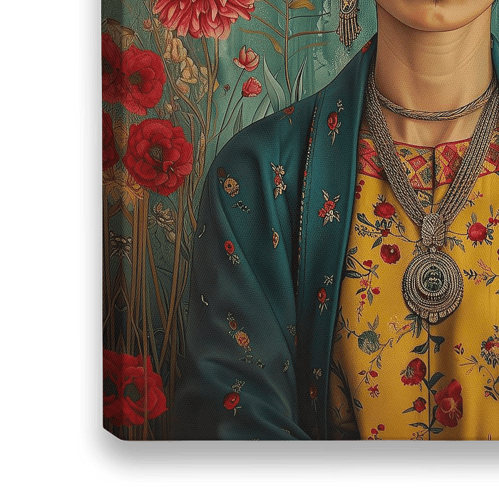 Portret van Frida in de stijl van uitgebreide bloemstukken. Ze draagt geel en blauw en heeft bloemen op haar hoofd en om haar nek. Op de achtergrond is een stadsgezicht met wilde bloemen te zien. Het kleurenpalet is licht blauwgroen en rood.