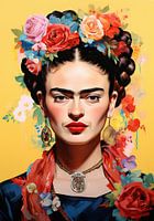 Een levendig portret van Frida, versierd met bloemen in haar haar en een rode sjaal om haar nek, tegen een iconische gele achtergrond. Het gedetailleerde en expressieve kunstwerk legt de essentie van de Mexicaanse cultuur vast, met de nadruk op haar gezicht. Het portret is in de stijl van Frida.