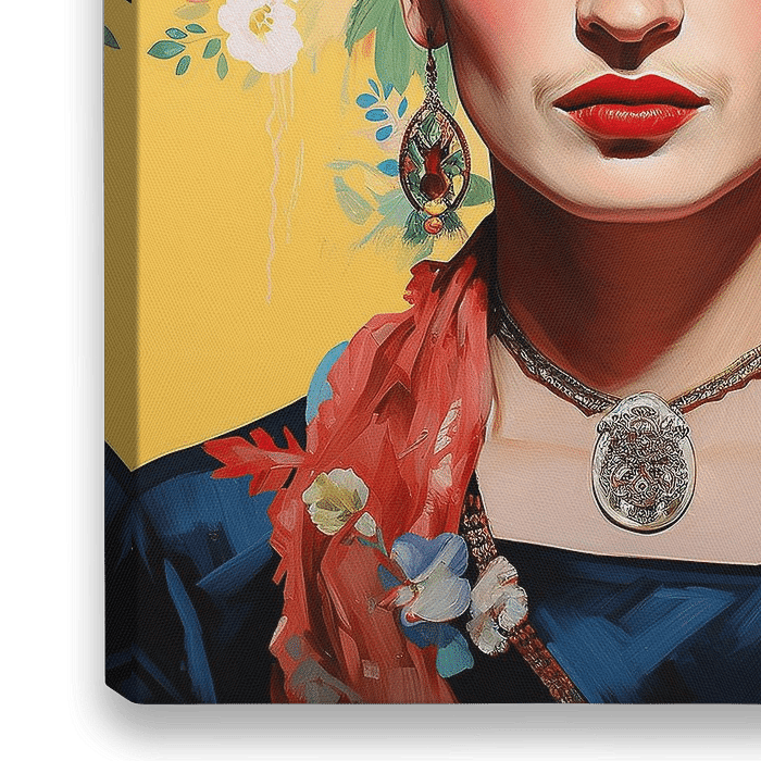 Een levendig portret van Frida, versierd met bloemen in haar haar en een rode sjaal om haar nek, tegen een iconische gele achtergrond. Het gedetailleerde en expressieve kunstwerk legt de essentie van de Mexicaanse cultuur vast, met de nadruk op haar gezicht. Het portret is in de stijl van Frida.