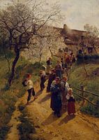 Op een dag in de lente loopt een dorp leeg. De mensen lopen de heuvel af over een pad onder de bomen vol in bloesem.