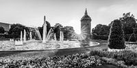 Zwart-wit fotografie fontein en watertoren op Friedrichsplatz in Mannheim bij zonsondergang, Baden-Württemberg, Duitsland