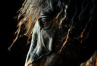 Een verfijnde fine art foto die het hoofd van een paard met lange manen vastlegt, geïnspireerd op de intense chiaroscuro portretten. De donkere composities, macrofotografie en het gebruik van lichtgevende schaduwen creëren een meeslepende sfeer. Dit kunstwerk, gedurfd maar tegelijkertijd sierlijk, toont de majesteit van het paard op een precieze en scherpe manier. De vormen worden geaccentueerd door de krachtige belichting, waardoor de kijker wordt meegenomen in de subtiele details van de paardenmanen.