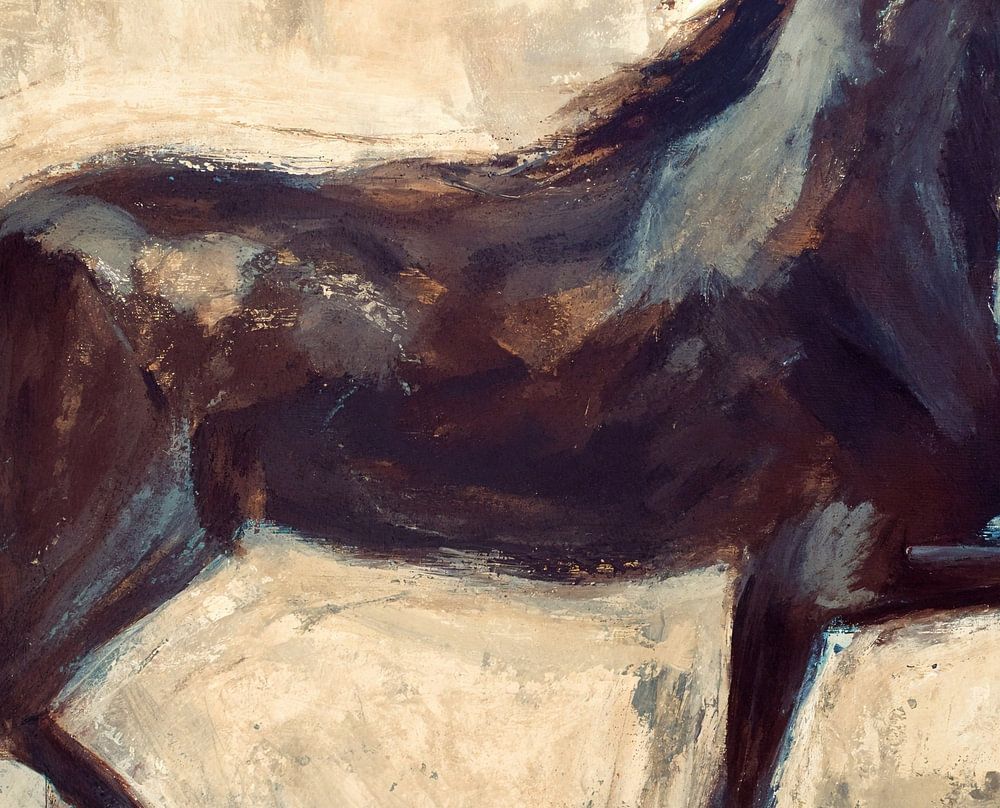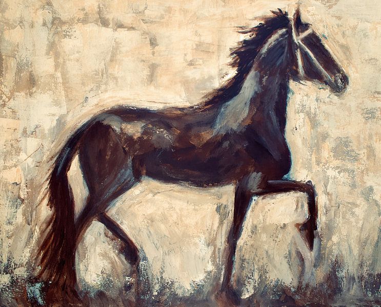Een abstract schilderij van een Fries paard. Het Friese paard is vormgegeven met een paletmes. Het schilderij van het Friese paard past door gebruik van natuurlijke kleuren in elk interieur