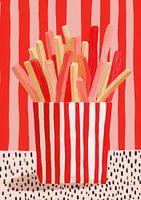 Een gouache schilderij toont Franse frietjes in een rood en wit gestreept papieren bekertje tegen een achtergrond met patroon. De compositie is minimalistisch, met duidelijke vormen, eenvoudige details en gedurfde kleurvlakken. De stijl doet denken aan mid-century modern design en het werk van Marjorie Sessler, met de nadruk op geometrische elementen en duidelijke contouren. De gereduceerde afbeelding combineert speelse kleurigheid met grafische helderheid en creëert een harmonieuze balans tussen patroon, vorm en kleur. De afbeelding is eenvoudig, esthetisch en geïnspireerd door de combinatie van retrodesign en moderne illustratie.