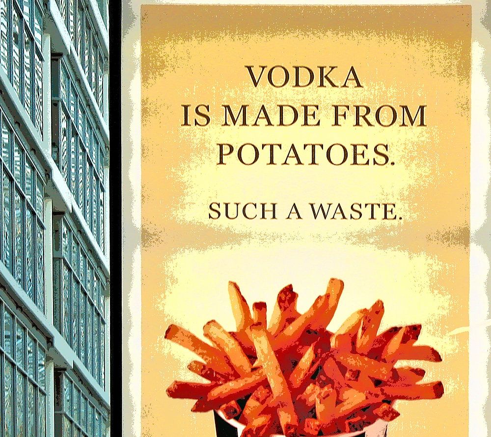 Affiche met opschrift "Wodka is gemaakt van aardappelen - wat een verspilling", Toronto, Canada