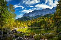 Frillensee, herfst, Beieren, Alpen, bergmeer, gouden kleuren, gletsjermeer, weerspiegeling, bos, bergen, fotografie, wandelen, meer, berg, water, lucht, natuur, Duitsland, Eibsee, Grainau, Zugspitze, landschap, toerisme, vakantie, recreatie, rust, idylle, Garmisch, Werdenfels, boom, oever, rots, dal, gras, zomer, vrije tijd, wellness, excursie, ontspanning