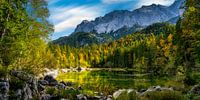 De mystieke Frillensee betovert met zijn spiegelgladde oppervlak voor de majestueuze Zugspitze. Heldere herfstkleuren baden de omringende bossen in warme tinten geel en oranje, terwijl het imposante rotsmassief dramatisch wordt weerspiegeld in het stille water. Grote rotsblokken omzomen de kristalheldere oevers en geven dit alpine landschap een ongerepte sfeer. Het zachte licht benadrukt perfect de natuurlijke schoonheid van dit Beierse berglandschap. Een tijdloos moment van rust aan de voet van de hoogste top van Duitsland - ideaal als wanddecoratie van hoge kwaliteit.