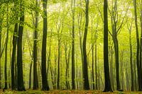 Beukenbos landschap in het Speulder- en Sprielderbos op de Veluwe. De bomen dragen fris groene bladeren en er hangt een lichte mist in de lucht.