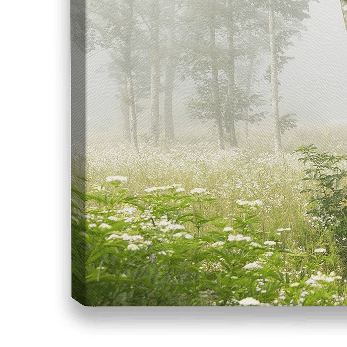 Een mistig landschap waar het frisse groen van de verschillende soorten bomen vanaf knalt. Op de voorgrond een wilde weide met witte bloemen. Gemaakt tijdens een mistige ochtend aan het meer van Bohinj in Slovenië. Hang je deze foto groot aan de muur? Als je héél goed kijkt, zie je achter de mist nog een blauwe kampeerbus.