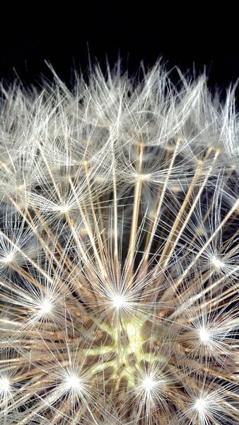 Dit is een bloemhoofd van een paardenbloem, met daarbovenop de witte pluisjes alsof het een nieuw kapsel is. Mooie witte pluizen die elk met een steeltje in het bloemhoofd staan, en daarmee samen het bloemhoofd bedekken. Het zijn zaden en later zullen ze loslaten en met de wind meegevoerd worden.